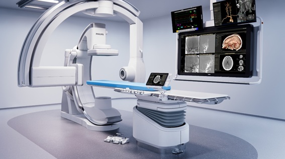 今回導入された装置は2つの異なるサイズを搭載したフラットパネル検出器バイプレーン式血管撮影装置で、脳神経外科領域を中心に心臓領域や下肢領域等全身領域のインターベンションを実施することが可能です。特に2つの検出器を搭載しているため1回の造影撮影で2方向から同時に画像を得ることが可能になり患者様の負担を最小限に抑えます。さらに従来よりも4倍の性能を誇る最新型検出器により通常の半分以下の被ばく線量で検査・治療が行えるようになったほか、頭部領域の細かな血管構造を瞬時に把握する3Dイメージング機能など、最新のガイダンスツールを搭載して、より安全で確実なインターベンション治療を提供します。