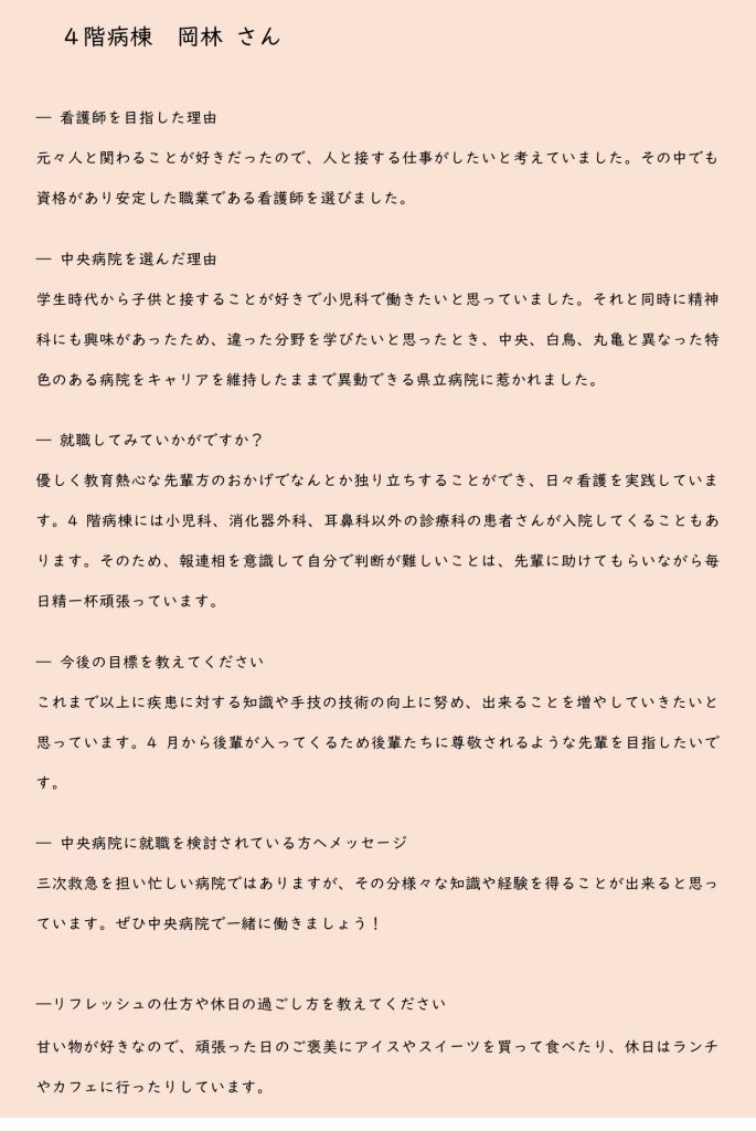 フレッシュナース 4階病棟 岡林 さん